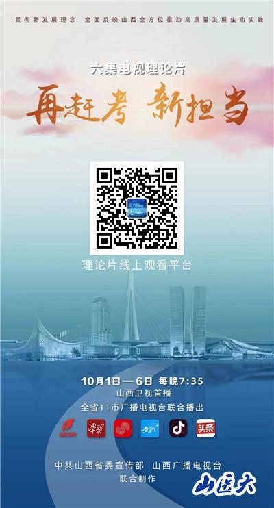 电视理论片《再赶考·新担当》,是呈现省委团结带领3500万山西人民牢记领袖嘱托、全方位推动高质量发展的实践库,是激励三晋儿女奋进新征程、建功新时代、用不懈奋斗创造高品质生活的加油站,全面反映全省各界喜迎党的二十大的实际行动和实践成果。按照省委安排部署,该片10月1日-6日每晚7:35在山西卫视首播,请积极动员广大师生医护员工认真学习收看。