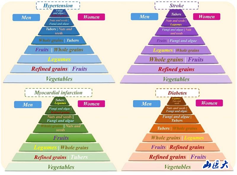 慢性病,特别是心血管疾病和糖尿病,构成了全球健康的重大负担,且饮食因素对这些慢性病的发生与发展有重要影响。以往研究表明,地中海饮食以及植物性饮食(如水果、蔬菜、坚果和全谷物)可显著降低心血管疾病的发病风险。尽管植物性饮食的健康益处已被广泛认可,现有纵向研究中关于饮食与慢性病发病风险的时不变和线性关联假设,可能导致对二者关系的估计偏差。此外,多病共存和性别差异往往被忽视,这限制了饮食建议的个体化和全面性。本研究利用中国健康与营养调查数据,结合纵向研究中时变混杂控制的方法,评估植物性食物摄入与四种慢性病(高血压、脑卒中、心梗、糖尿病)发病风险之间的长期平均剂量-反应关系及其性别差异,构建了与慢性病预防相关的植物性食物饮食金字塔(图一),发现不论男性女性,食用富含蔬菜、全谷物、水果、真菌和藻类的饮食可同时降低四种慢性病的患病风险;而男性可以适度地摄入精制谷物;女性应增加坚果和种子的摄入量,以降低慢性疾病的发病风险。该研究结论为制定更精准的慢性病预防策略提供依据。