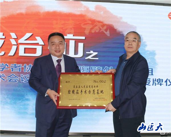 授牌仪式上,大会主席赵文波主任代表山西省专家学者协会授予灵丘县人民医院普外科“腔镜疝手术示范基地”牌匾,灵丘县人民医院院长王会云代表县人民医院接受牌匾。