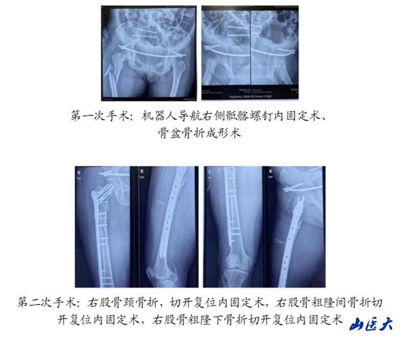 由于唐女士重度多发伤,对手术耐受性较差,创伤中心救治团队结合其病情和身体状况,经过认真研究,决定分次对其进行手术治疗,以减轻长时间手术对患者身体的打击。考虑骨盆前后环骨折,并有垂直不稳定,后环骨折经骶骨孔骨折,手术极易出现骶神经损伤,创伤中心团队经过科学分析,采用机器人导航技术成功对患者骶骨骨折部位进行了固定,避免了出现神经损伤问题。针对患者右大腿近端粉碎性骨折,骨折移位大,缺乏合适的手术器材问题,救治团队经过反复讨论,准备了两套手术方案择机调整,最终取得了良好的手术固定效果。术后,唐女士转入重症监护室,在医护人员的精心照料下,身体状况转危为安,并逐渐开始康复锻炼,恢复肢体功能,治疗效果非常理想。唐女士感激地说:“是我校第二医院医护人员的精湛医术和无私奉献,让我重获新生!”