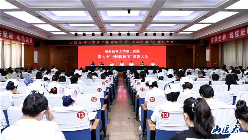 为弘扬医者无私奉献、救死扶伤的高尚情操,激发全院医师的职业自豪感与使命感,8月22日下午,我校第二医院在影像楼六层大学术报告厅召开第七个“中国医师节”表彰大会,对在医院医疗工作中表现突出的医师进行集中表彰。全体院领导出席会议,各党支部书记、科主任、护士长和受表彰人员代表参加会议。