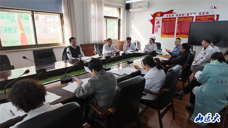郭洪波汇报了中医科工作现状以及下一步计划。他指出,要通过与各西医临床科室开展深度合作,建立联合查房、联合攻关等机制,开展西学中人员培训,在全院大力推广中医药适宜技术应用。黄河对中医药人员培训、西医人员学习中医方式等具体工作提出了建议。